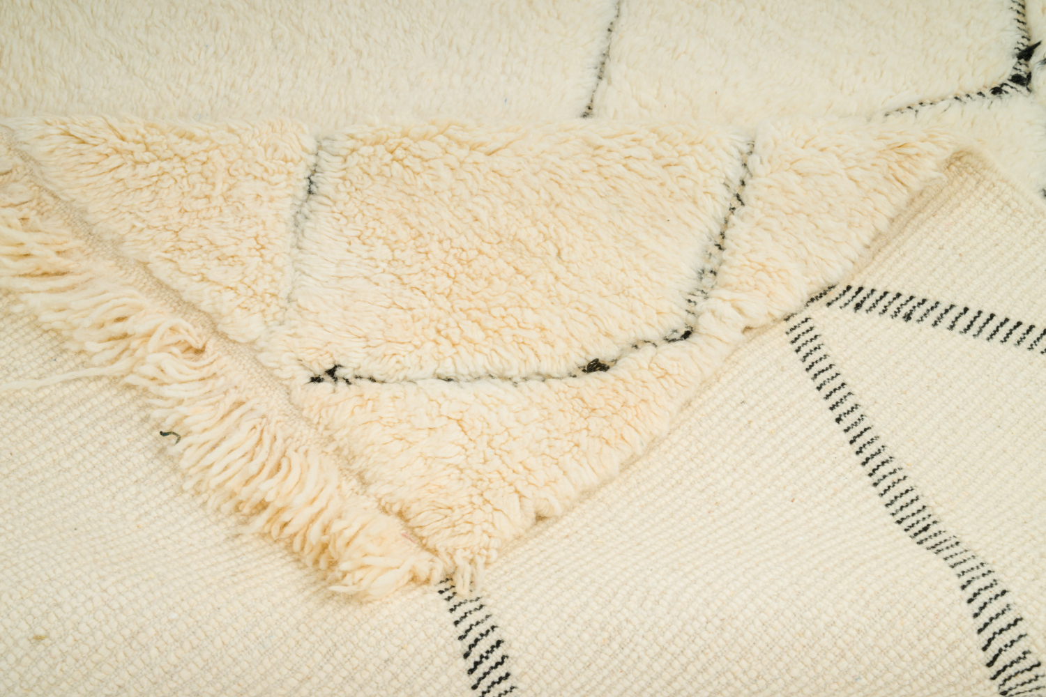 Ulden fra fårene i Atlasbjergene er virkelig enestående og et Beni Ourain tæppe fremstilles kun af denne rene uld og dens naturlige farver, der er både hvide, elfenbenshvide og naturfarvede. Et ægte Beni Ourain tæppe er vævet med enkle og avancerede mønstre og er stærkt eftertragtet af designere og forbrugere i hele verden. Et marokkansk Beni Ourain tæppe er et kunstværk på gulvet. Hvis det passes korrekt vil det beholde sine smukke farver, ulden bliver ikke slidt op. Det bliver et tæppe der føres videre i generationer.