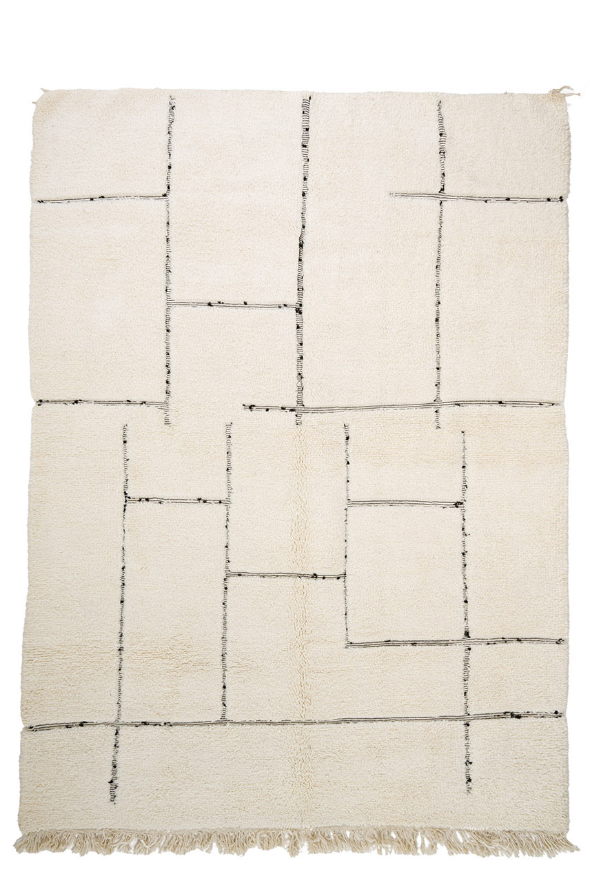 Ulden fra fårene i Atlasbjergene er virkelig enestående og et Beni Ourain tæppe fremstilles kun af denne rene uld og dens naturlige farver, der er både hvide, elfenbenshvide og naturfarvede. Et ægte Beni Ourain tæppe er vævet med enkle og avancerede mønstre og er stærkt eftertragtet af designere og forbrugere i hele verden. Et marokkansk Beni Ourain tæppe er et kunstværk på gulvet. Hvis det passes korrekt vil det beholde sine smukke farver, ulden bliver ikke slidt op. Det bliver et tæppe der føres videre i generationer.