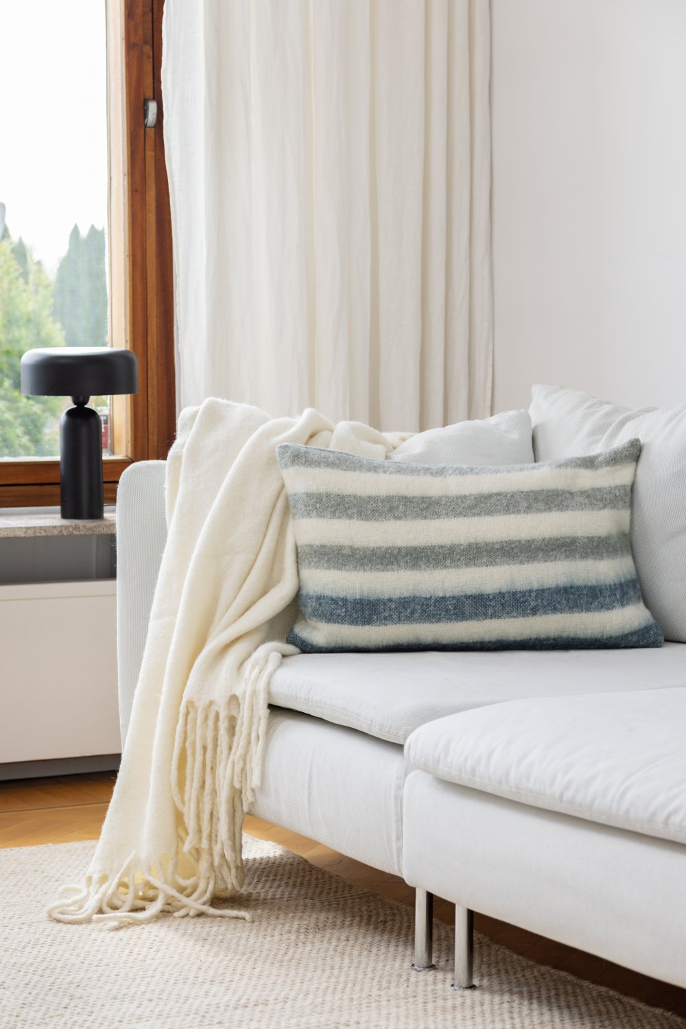 Blødt pudebetræk i en dejlig uldblanding. De garnfarvede pudebetræk fås i flere mønstre og farver og kan med fordel matches med hinanden.