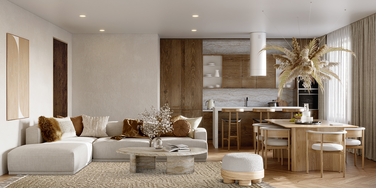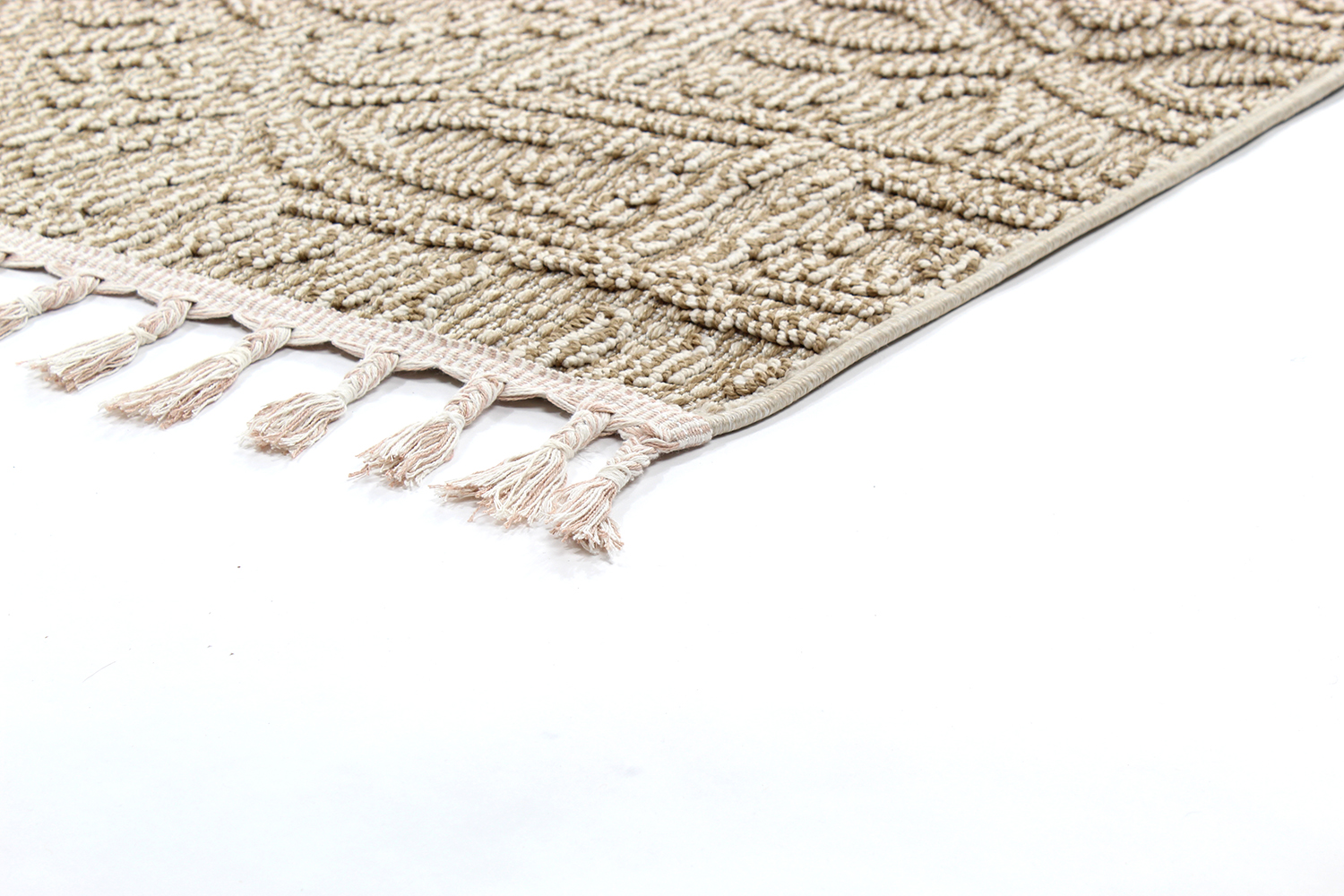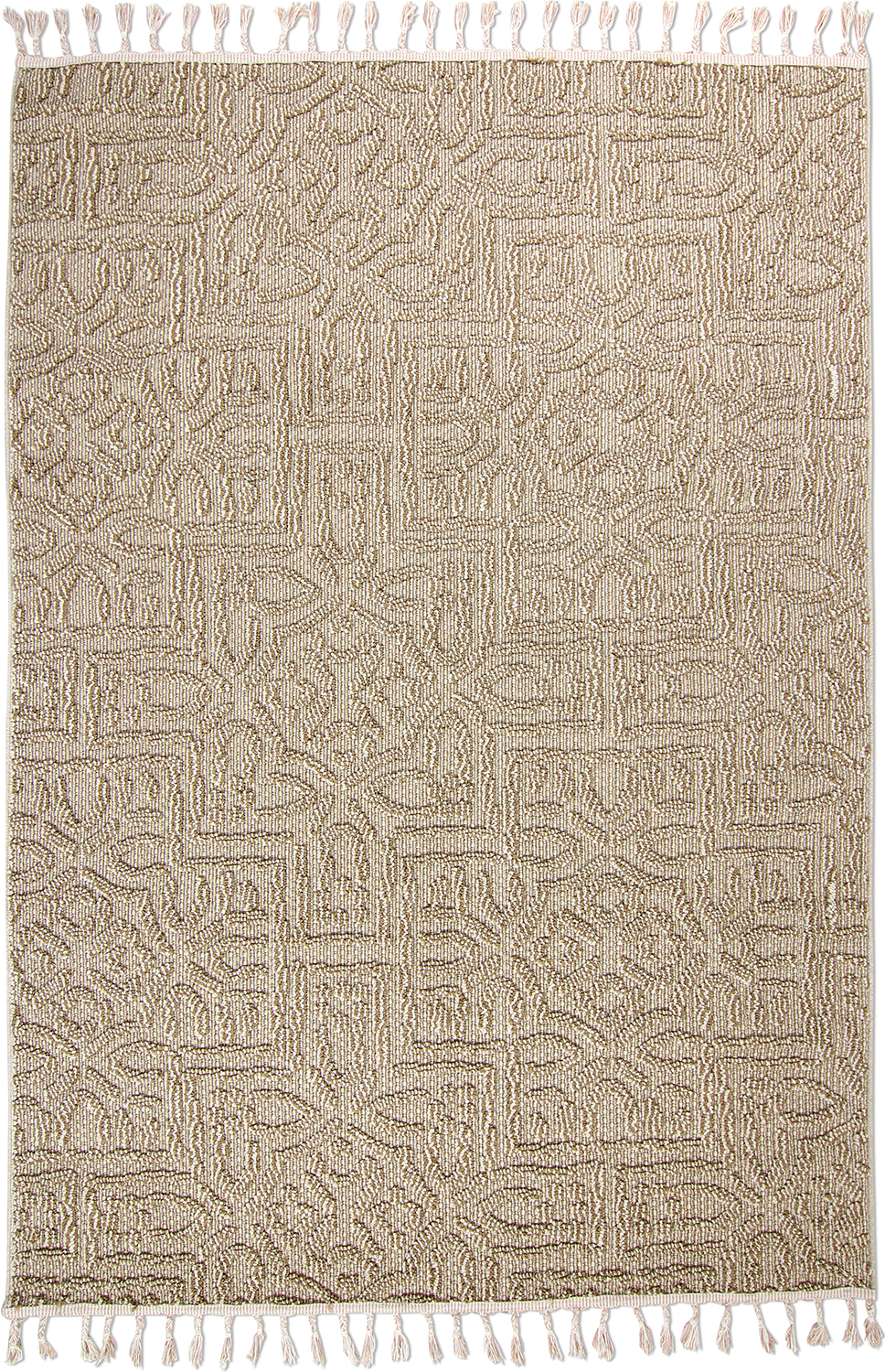 Mønstret, beige ludtæppe, velegnet til både indendørs og udendørs brug.