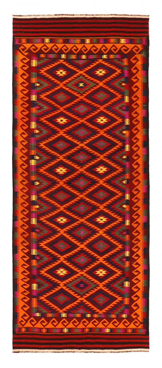 Orientalsk kelimtæppe forener en fladvævet struktur med naturlig uld – let og fleksibelt, nemt at placere i entré, stue eller under spisebordet. Den slanke profil gør det også oplagt til layering oven på større tæpper.