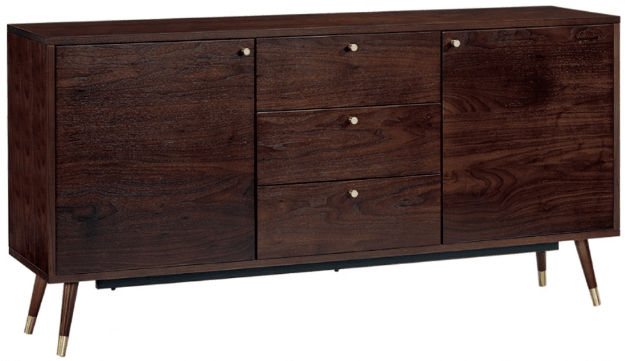 Sideboardet er fremstillet i rustikt valnødsfinér med naturlige ådringer og subtile detaljer i børstet messing – en perfekt balance mellem klassisk elegance og moderne form.