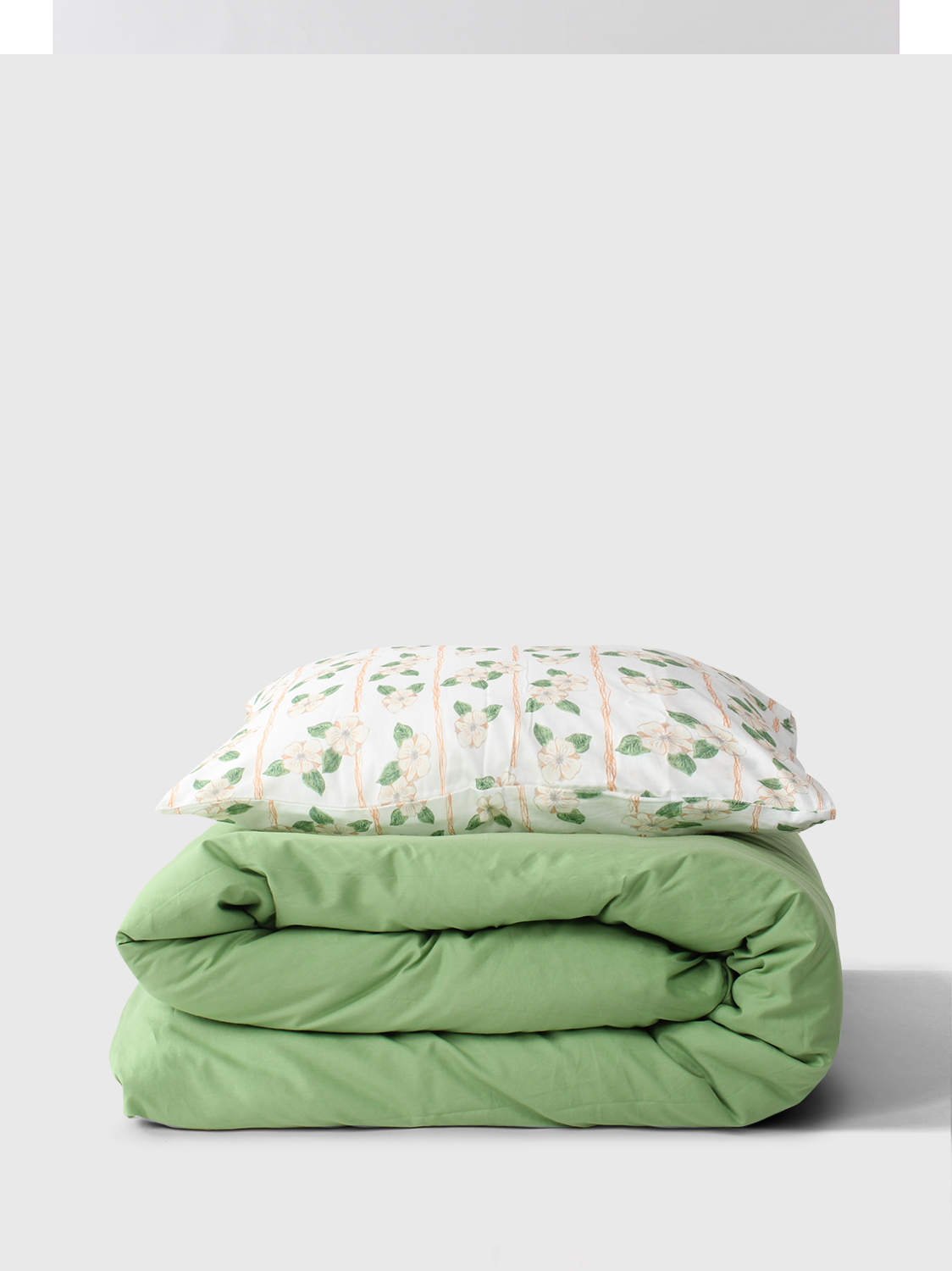Bomuldssengesæt. Tilføj et personligt præg på soveværelset med et mønstret dynebetræk-sæt. Dette sæt, der består af et dynebetræk og et matchende pudebetræk, er skabt med omhyggelig præcision og lavet af høj kvalitet 100% bomuld. Bomuld er et materiale kendt for både sin blødhed og åndbarhed, og det giver optimal temperaturregulering gennem natten, uanset årstiden.