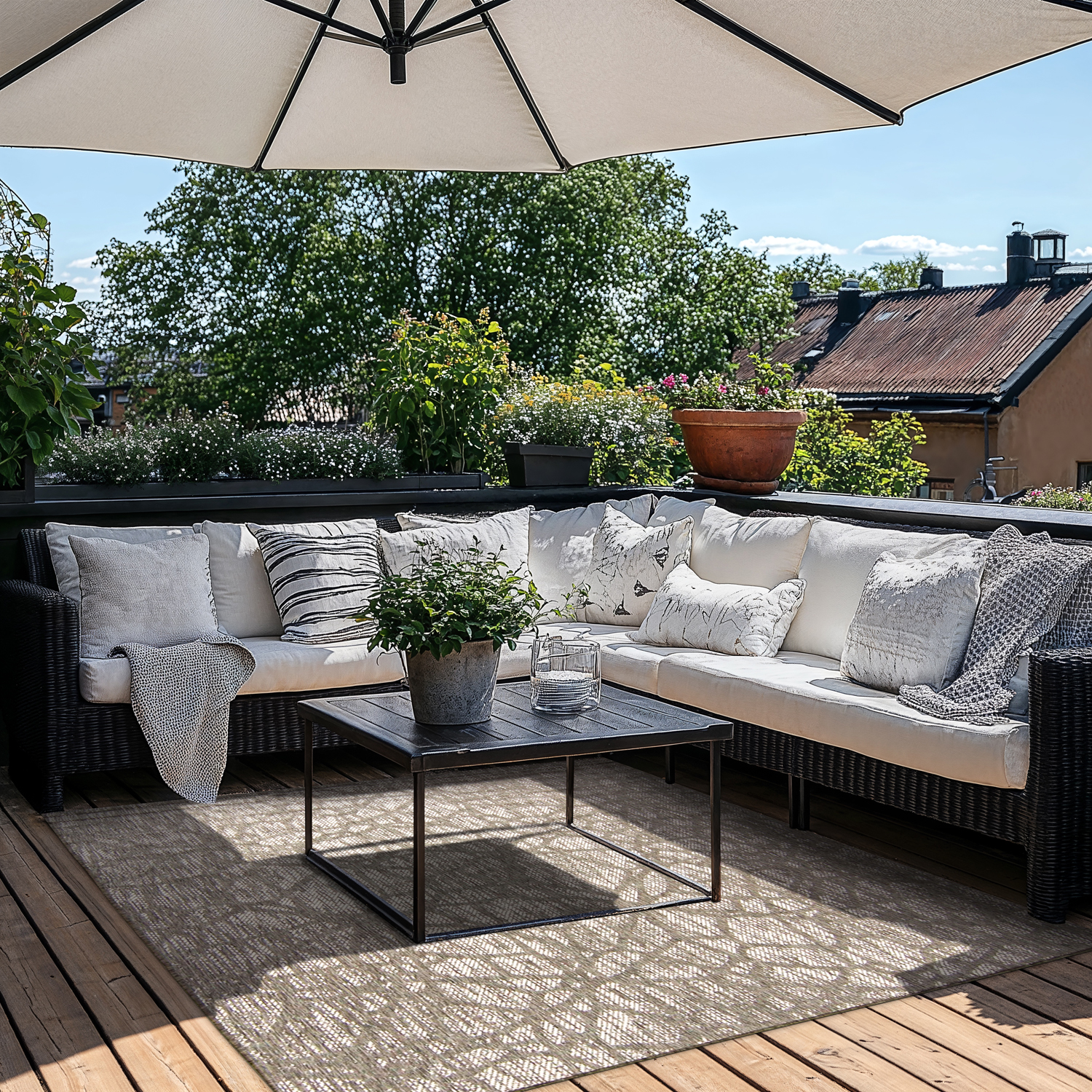 Indendørs- / Udendørs-tæppe. Moderne tæppe som er en del af Trendcarpet Art Line. Anvendes som et tæppe til dagligstuen eller et andet rum hvor det får den opmærksomhed, det fortjener. Et Wilton-tæppe der er inspireret af nutidens designere og moderne mønstre. Kvaliteten er meget høj og prisen er lav da tæppet maskinvæves, hvilket indebærer, at tæppets pris bliver billigere end hvis det blev håndlavet.