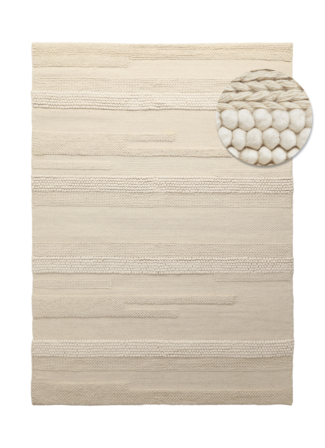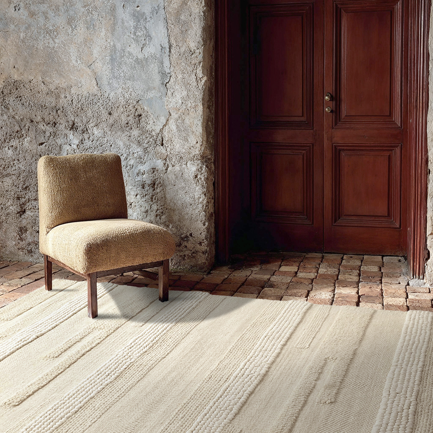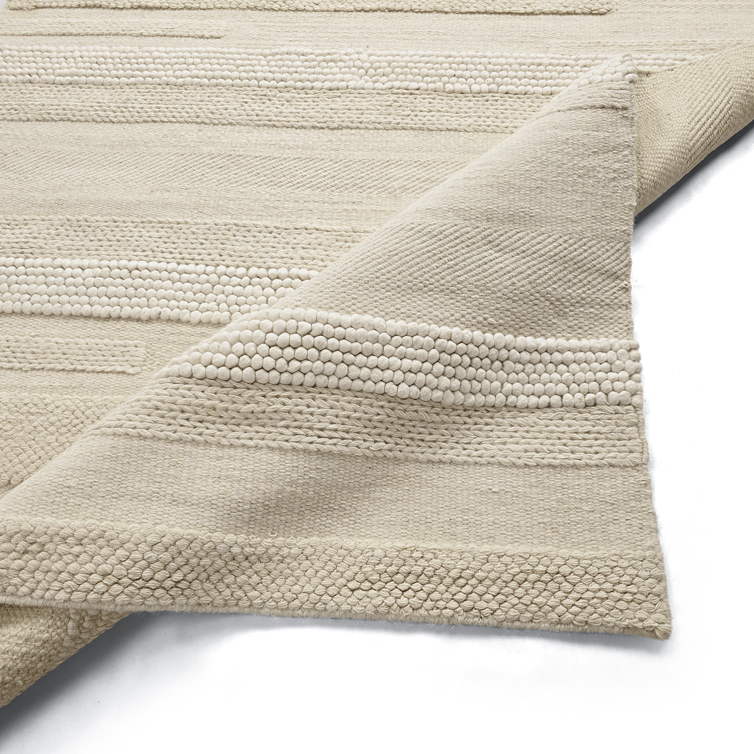 Uldtæppe med et mønster, der træder subtilt frem gennem variationer i væveteknik. Hver sektion er håndvævet med forskellige strukturer, som fanger lys og skygge på unikke måder. Resultatet er et tidløst tæppe med taktil fornemmelse og kunstnerisk karakter – perfekt til dig, der ønsker et moderne, men harmonisk element i indretningen.