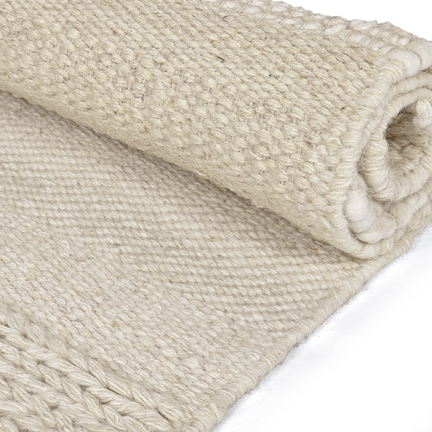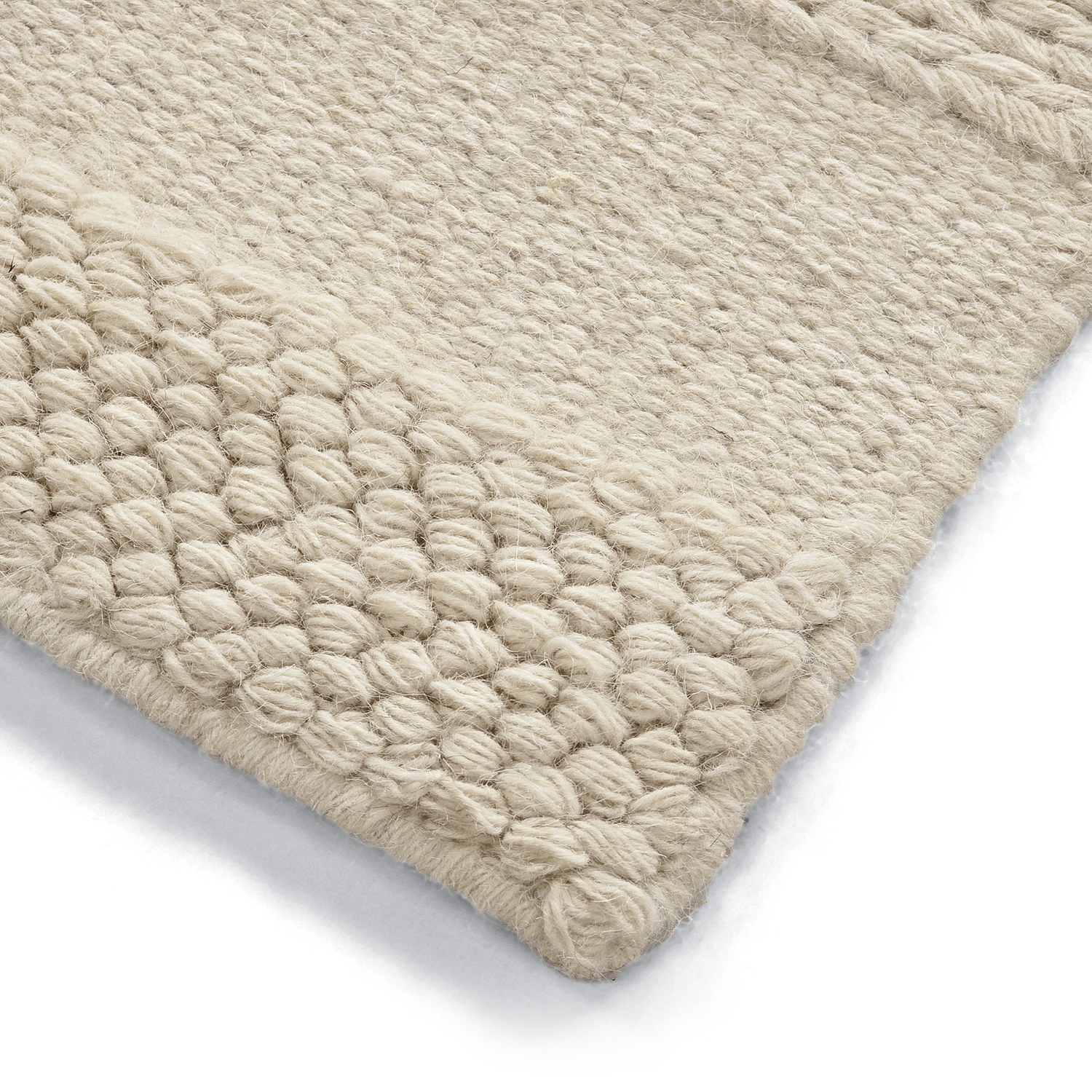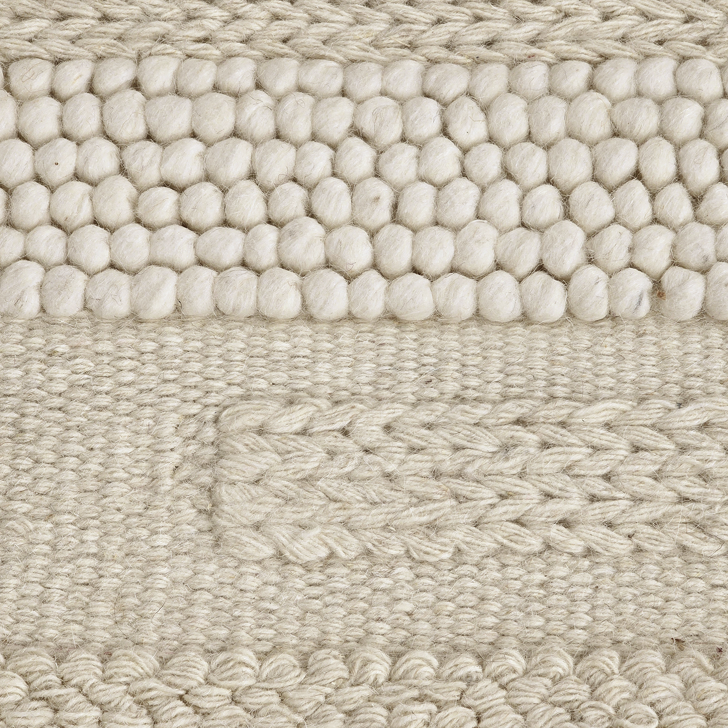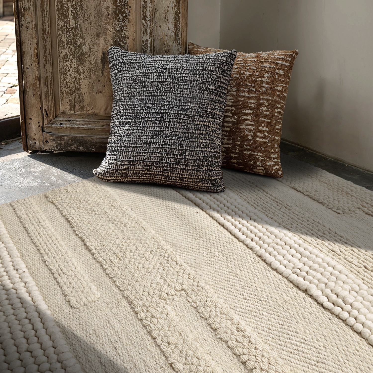 Uldtæppe med et mønster, der træder subtilt frem gennem variationer i væveteknik. Hver sektion er håndvævet med forskellige strukturer, som fanger lys og skygge på unikke måder. Resultatet er et tidløst tæppe med taktil fornemmelse og kunstnerisk karakter – perfekt til dig, der ønsker et moderne, men harmonisk element i indretningen.