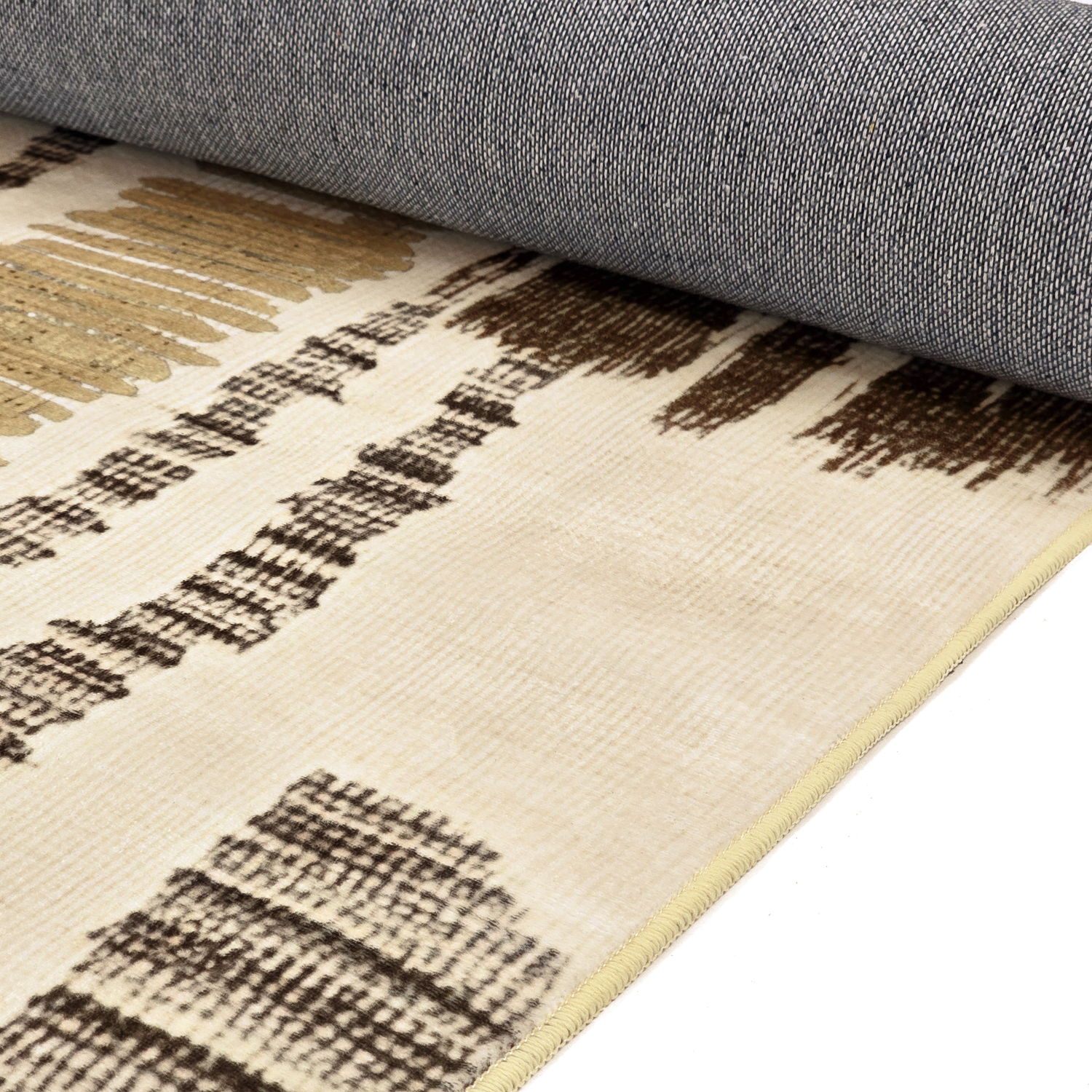 Mønstret er inspireret af moderne designere og nutidens trends, og tæppet er en del af vores populære Art-kollektion. Takket være den maskinvævede produktion kan vi tilbyde høj kvalitet til en rigtig god pris – du får et tæppe, der både ser dyrere ud og føles mere luksuriøst, end prisen antyder.
