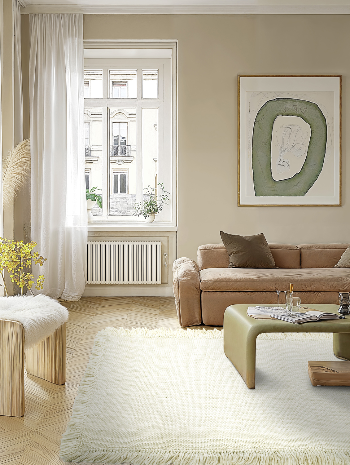 Et smukt og holdbart tæppe vævet i garn spundet af en blanding af uld og genanvendt PET. Kombinationen giver en slidstærk kvalitet med en blød fornemmelse og naturlig struktur. Takket være den genanvendte PET-fiber er tæppet et miljøbevidst valg, mens ulden tilfører varme og en eksklusiv tekstur. Den naturlige farve fremhæver materialernes ægthed og gør tæppet nemt at matche i enhver indretning.