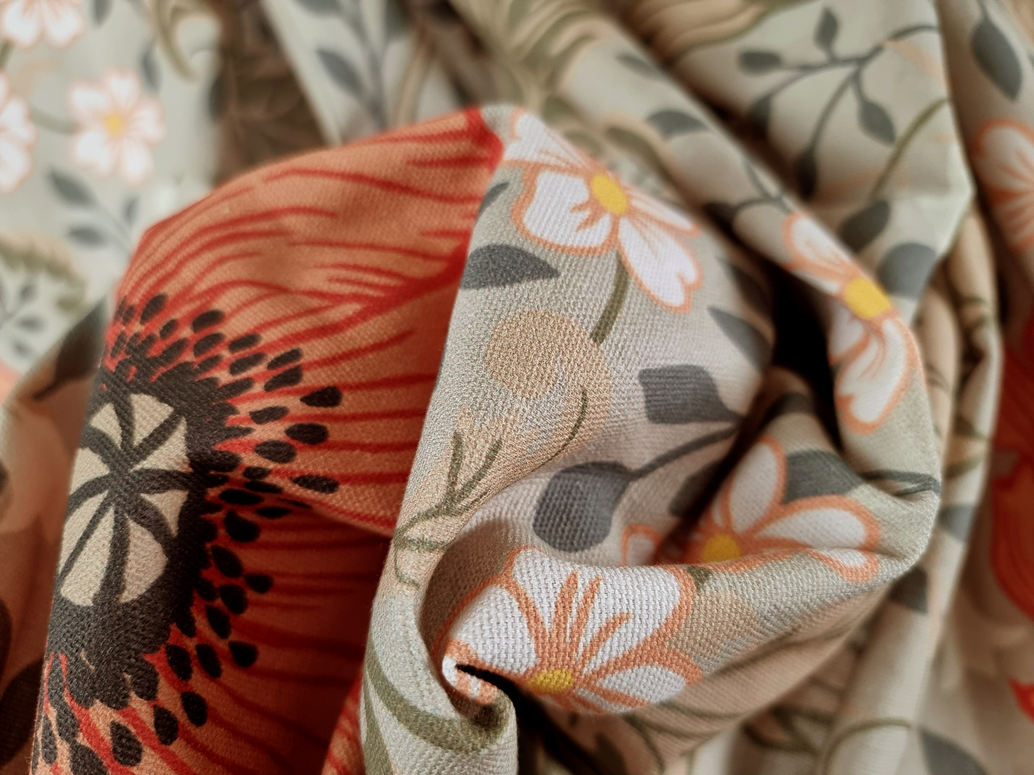 Gardin fra kollektionen "Poppy", skabt i samarbejde med den talentfulde designer Hanna Wendelbo. I skabelsen af kollektionen har Hanna fundet inspiration i naturens vidunderlige mangfoldighed og præsenterer i Poppy-kollektionen et dejligt blomstermønster, der gennemsyrer hver detalje.