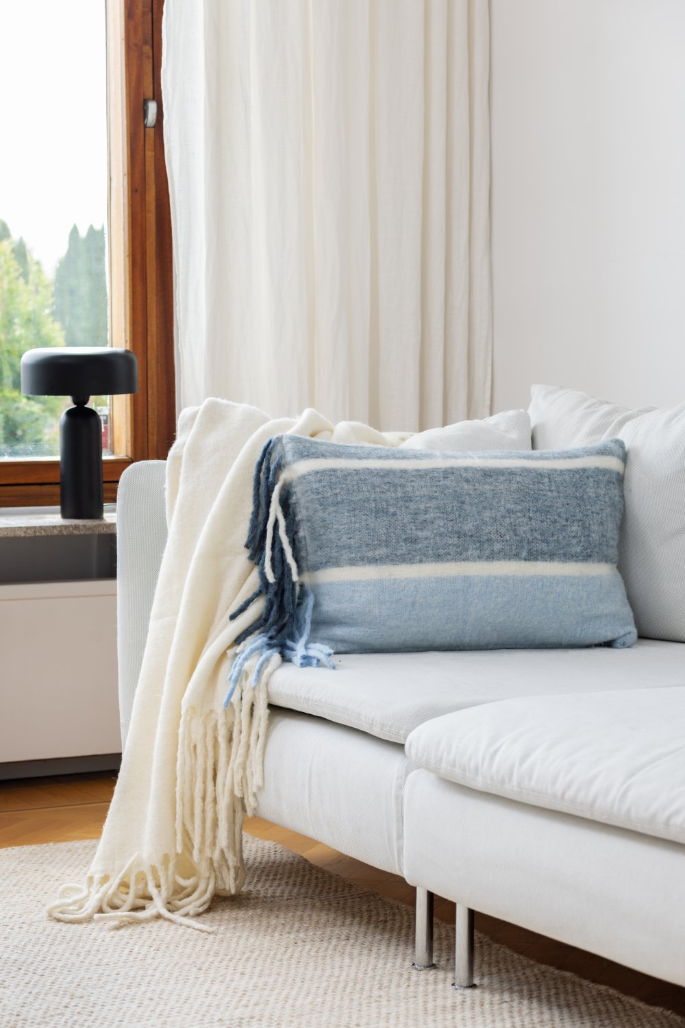 Blødt pudebetræk i en dejlig uldblanding med frynser på den korte side. De garnfarvede pudebetræk fås i flere mønstre og farver og kan med fordel matches med hinanden.