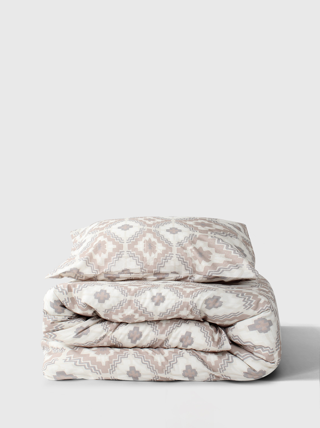 Bomuldssengesæt. Tilføj et personligt præg på soveværelset med et mønstret dynebetræk-sæt. Dette sæt, der består af et dynebetræk og et matchende pudebetræk, er skabt med omhyggelig præcision og lavet af høj kvalitet 100% bomuld. Bomuld er et materiale kendt for både sin blødhed og åndbarhed, og det giver optimal temperaturregulering gennem natten, uanset årstiden.